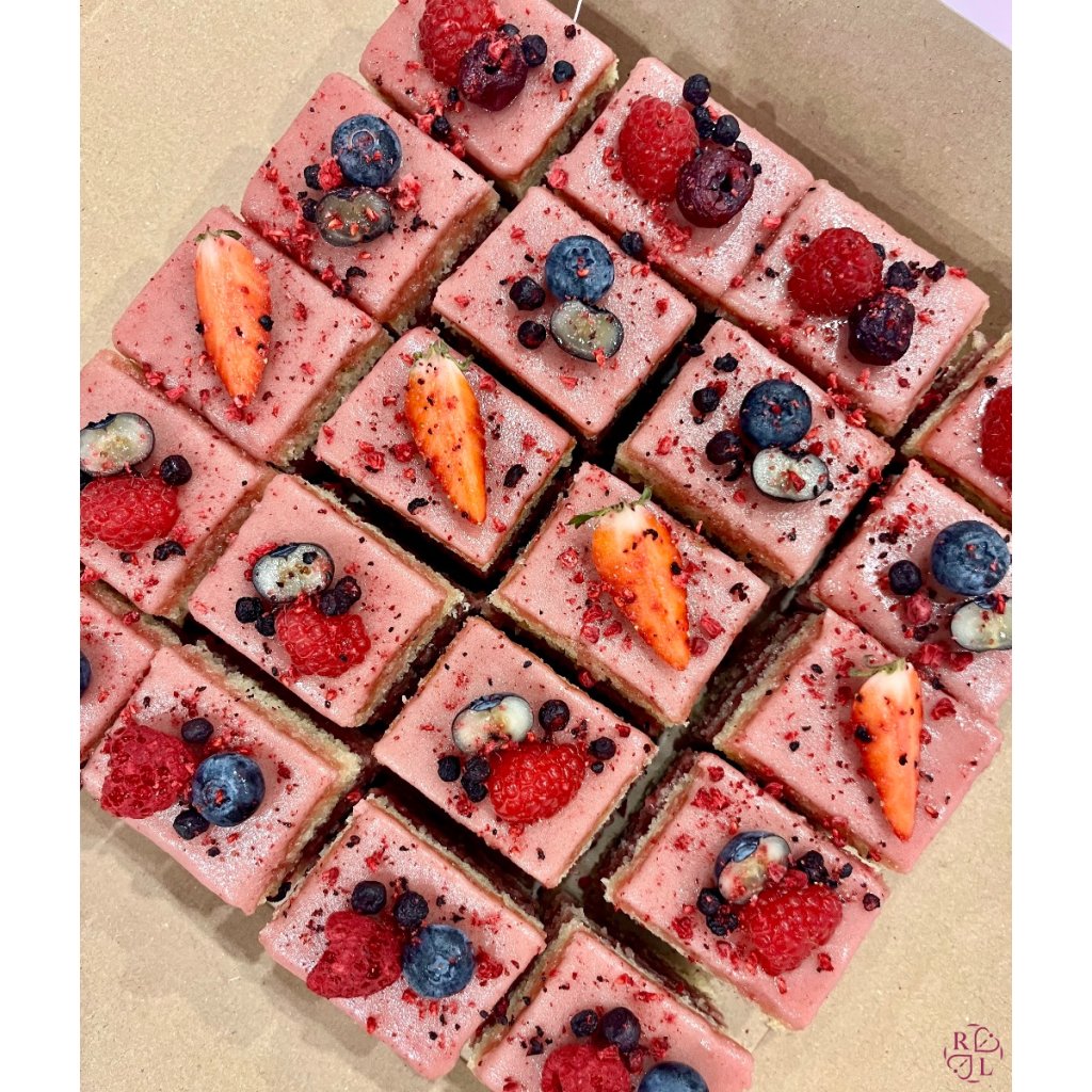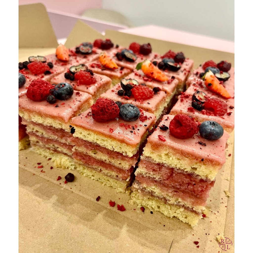 Kokosový nápoj, malinový sirup (Malinová šťava min. 50 % (maliny plod, filtrovaná voda), sacharóza, antioxidant: kyselina citrónová), jahodové víno (obsah alkoholu 9% obj., antioxidant: oxid siričitý), trstinový nerafinovaný surový cukor, ryžová múka, tapioková múka, pšenová múka, mandľová múka, bio malinová nátierka (maliny 55%, repný cukor, koncentrát citrónovej šťavy, želírujúca látka: pektín), pomarančová šťava, citrónová šťava, rum 40 %, bio nerafinovaný repkový olej, bio jablčný ocot, prášok do pečiva bezfosfátový, jedlá sóda bikarbóna, guaranová guma, cviklový prášok, vanilka čistý extrakt, himalájska soľ, klinček, škorica, badyán + ovocie čerstvé/lyo na zdobenie